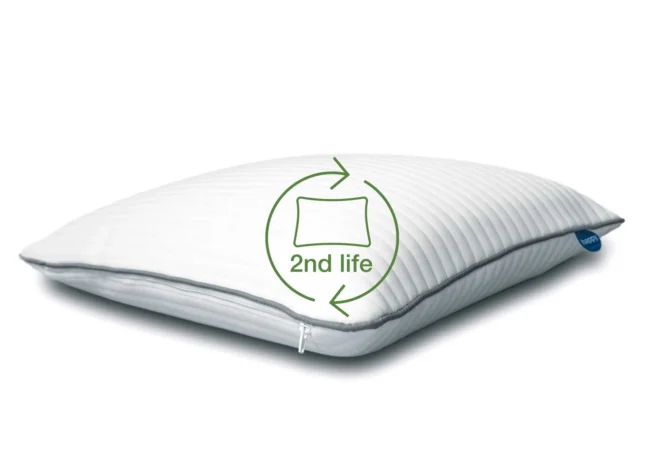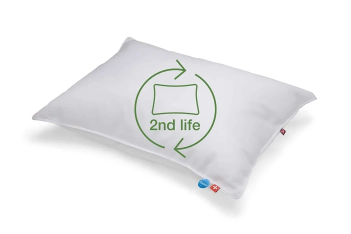 Après le nettoyage, les housses et les noyaux d’oreiller sont réunis et préparés à leur seconde vie. Le noyau est remis dans la housse, l’oreiller est emballé dans un film plastique et placé dans la boîte. L’autocollant vert 2nd life indique qu’il s’agit d’un produit seconde vie.