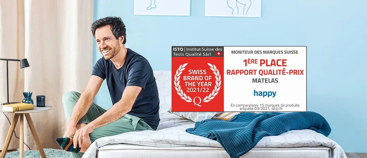 1ère place pour les matelas happy. L’Institut Suisse des Tests Qualité (ISTQ), un organisme indépendant, nous a décerné la palme du rapport qualité-prix lors du test de qualité des matelas. Lis la suite pour découvrir ce qui ce qui se cache derrière cette récompense.